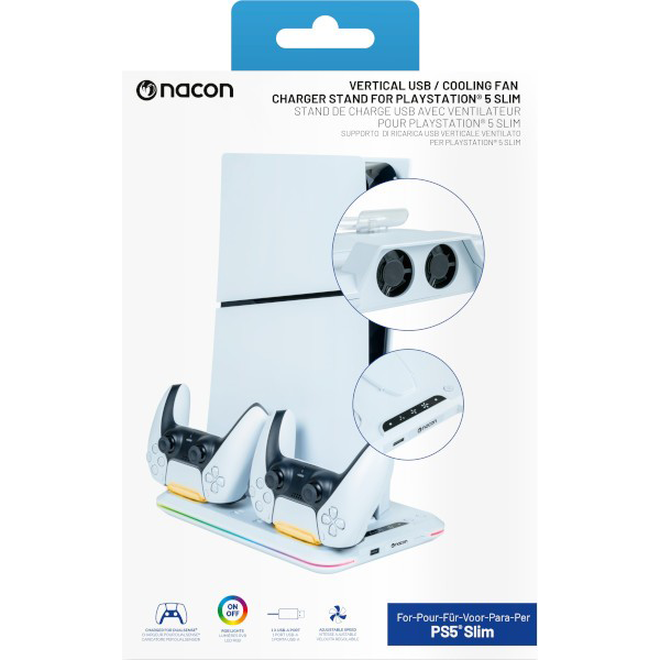 Nacon Soporte Vertical Delgado con Cargador USB x 2 Mandos Dualsense y Ventilador de Refrigeración