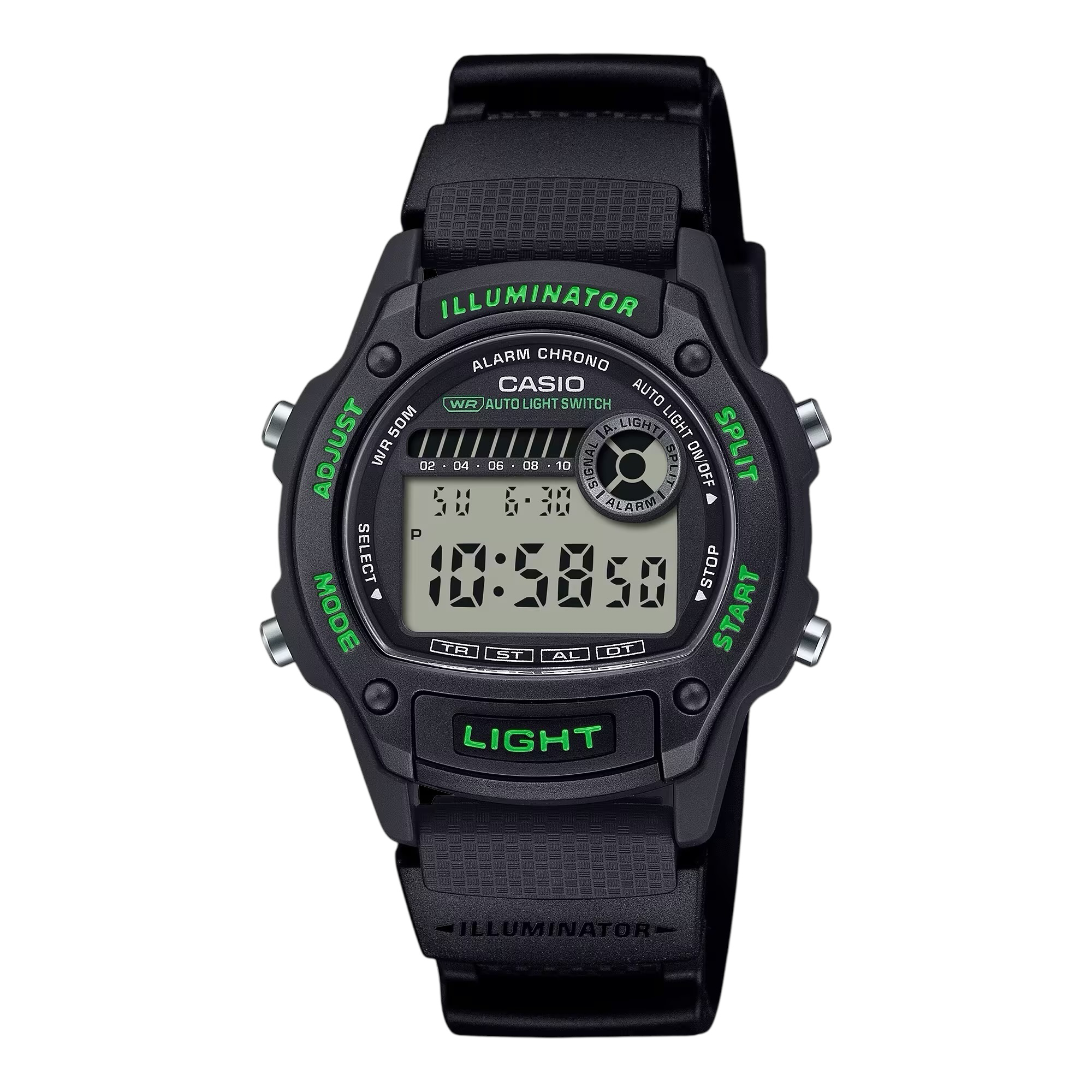 Cómodo y práctico, un reloj digital de tamaño medio con caja de 36,6 mm que ofrece un ajuste cómodo incluso en muñecas delgadas. Equipado con luz LED totalmente automática y un botón de luz específico en la parte delantera para una funcionalidad aún más práctica.