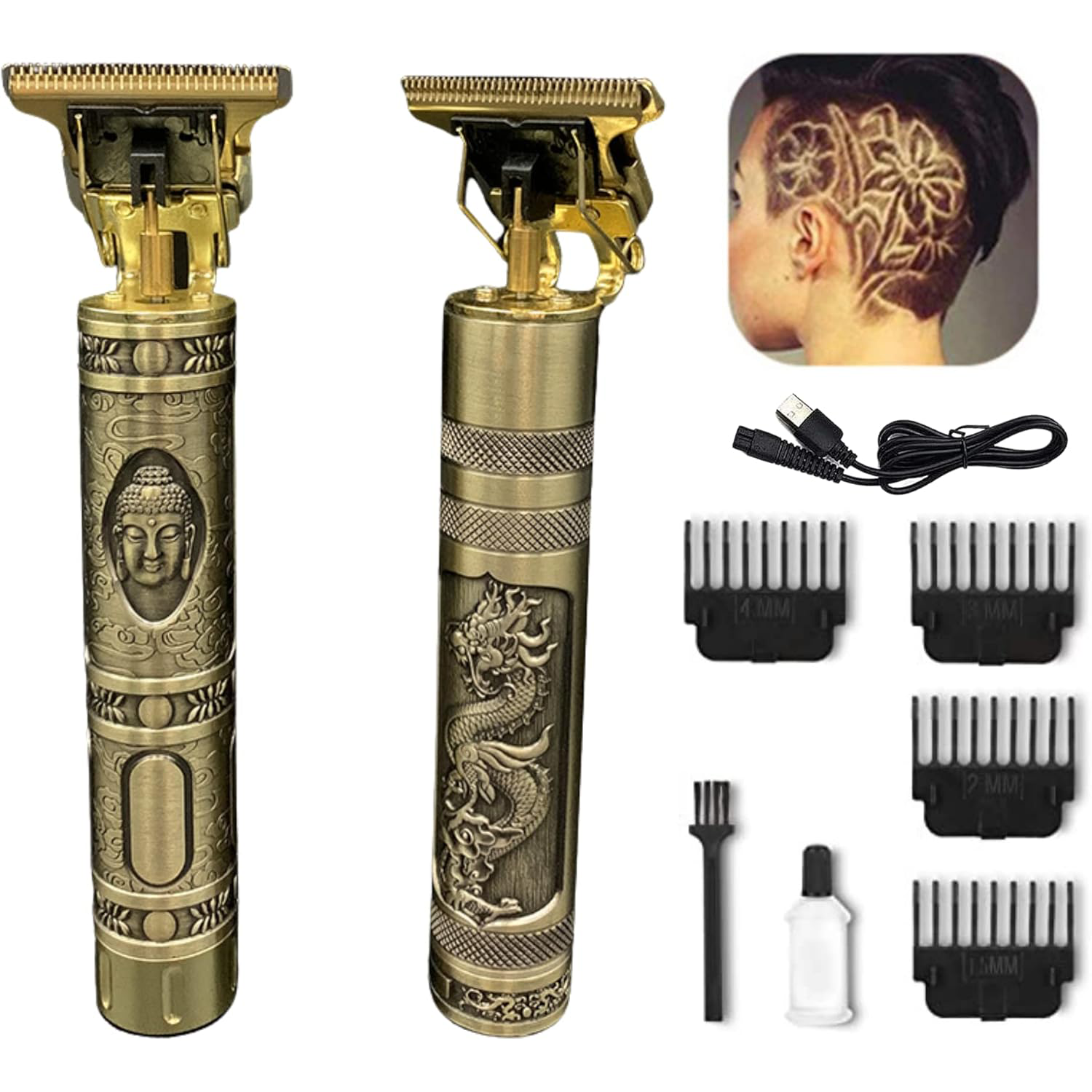 cortadora de pelo profesional HOPECOM, modelo HP-50720/50710, con un diseño elegante en tonos dorados y plateados. - Cuchillas de alta calidad para un corte avanzado. - Carga vía USB para mayor comodidad. - Diseño ergonómico y fácil de manejar.