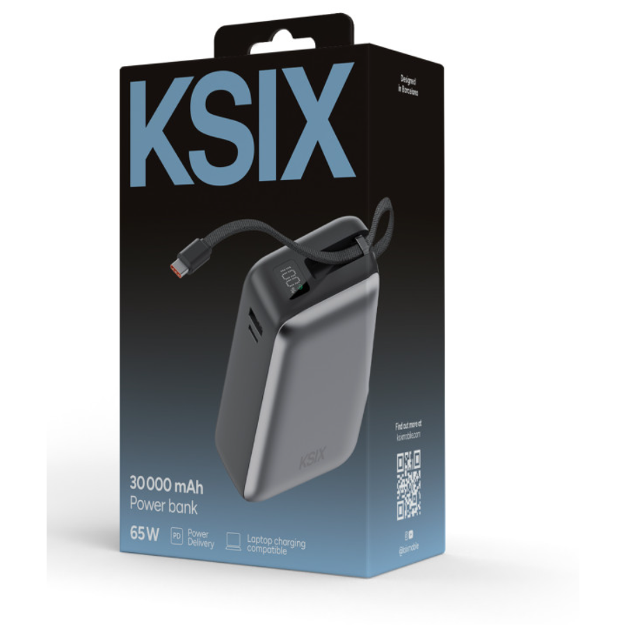 La power bank KSIX de 30.000 mAh es la solución definitiva para quienes necesitan una carga rápida y fiable en todo momento. Con una potencia de salida de hasta 65W y compatibilidad con la tecnología de carga rápida Power Delivery 3.0, es capaz de cargar dispositivos de alto rendimiento, incluidos portátiles, smartphones, tablets y más. Su diseño incorpora un cable USB-C integrado, eliminando la necesidad de cables adicionales para una carga más cómoda.