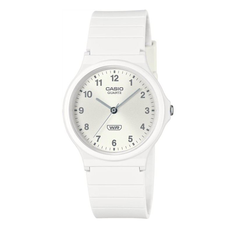 El Casio MQ-24B-7BEF es un reloj analógico unisex que combina un diseño atemporal con materiales responsables con el medio ambiente. Este modelo presenta las manecillas de horas, minutos y segundos junto con números de índice sencillos, todo en una gama de combinaciones de colores monocromáticos que brindan un aspecto minimalista y elegante. La caja y la correa están fabricadas en resina blanca, ofreciendo una sensación de ligereza y comodidad.